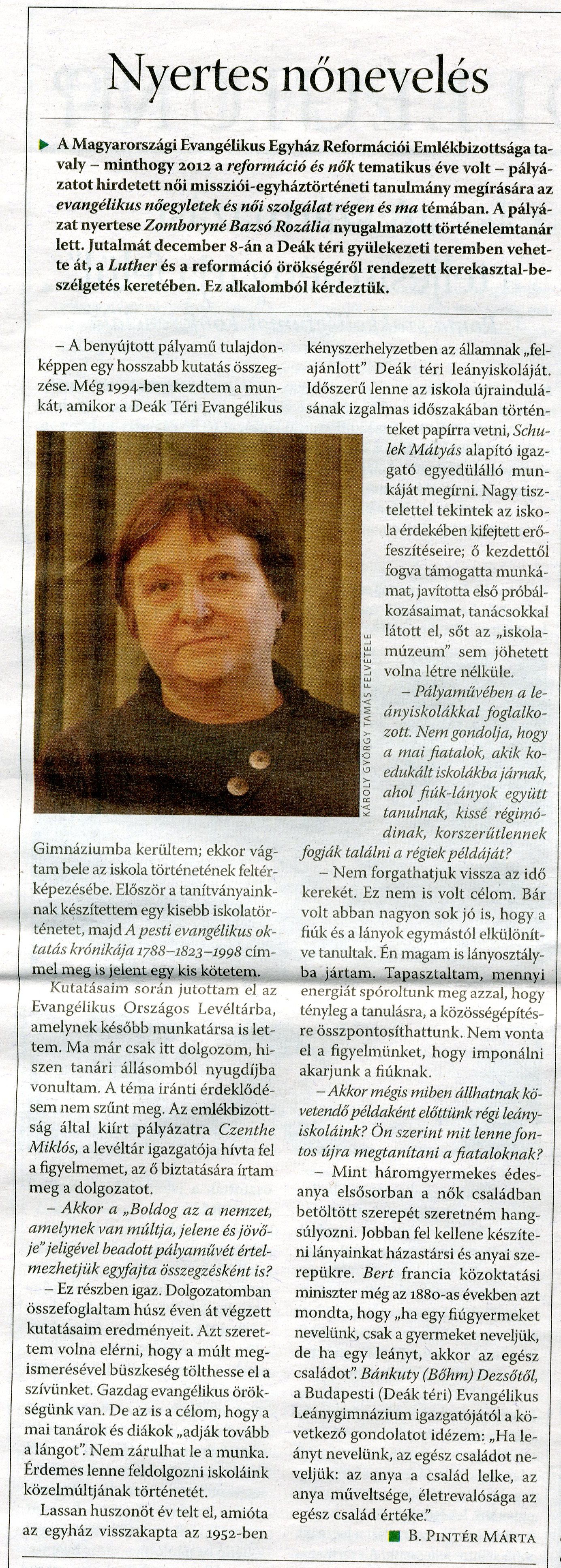B. Pintér Márta: Nyertes nőnevelés. [Interjú Zomboryné Bazsó Rozáliával]