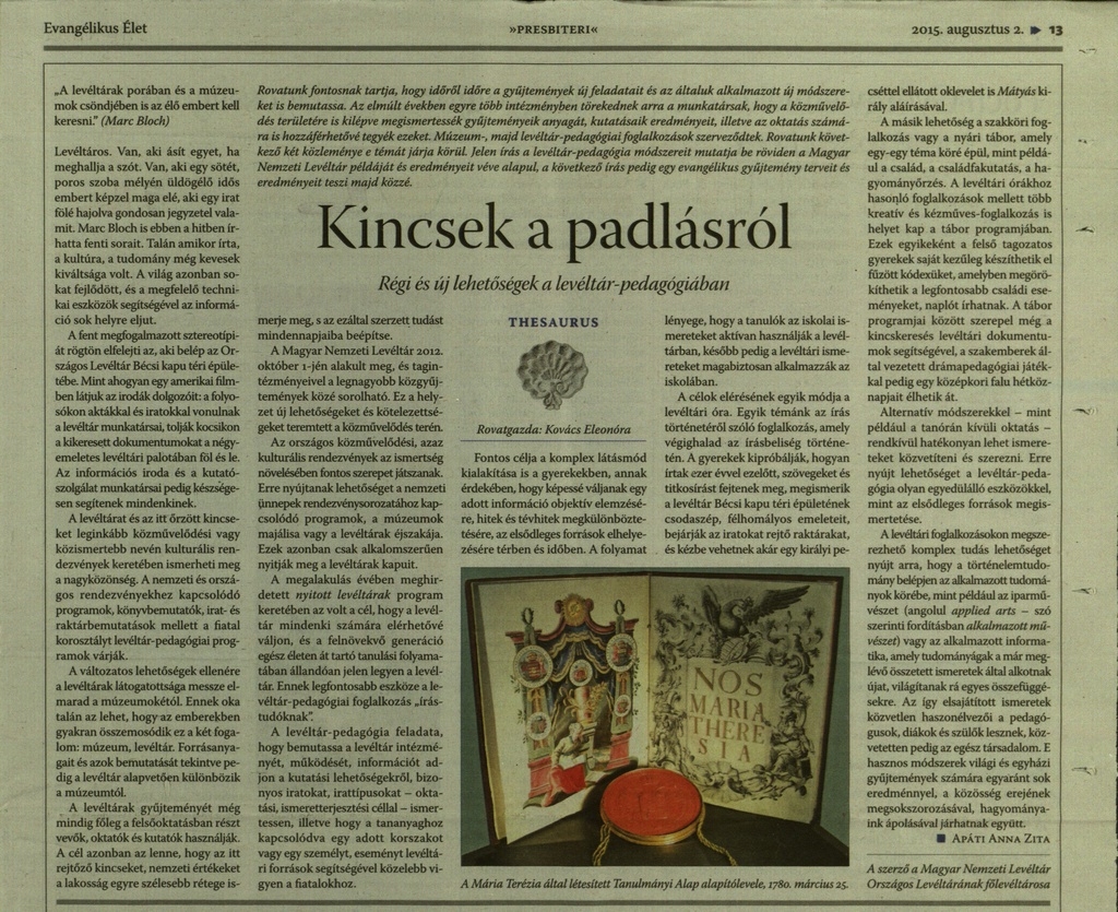 Apáti Anna Zita: Kincsek a padlásról. Régi és új lehetőségek a levéltár-pedagógiában