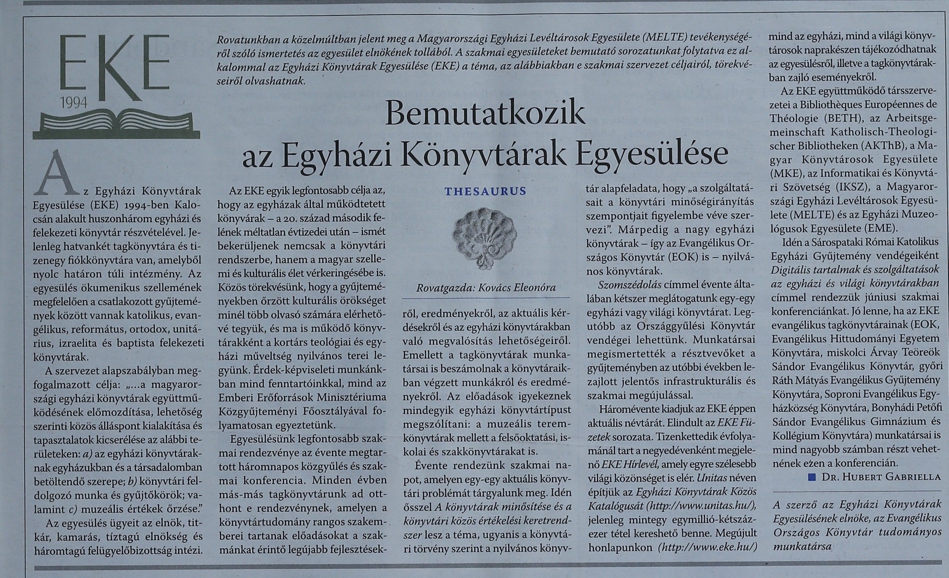 Hubert Gabriella: Bemutatkozik az Egyházi Könyvtárak Egyesülése