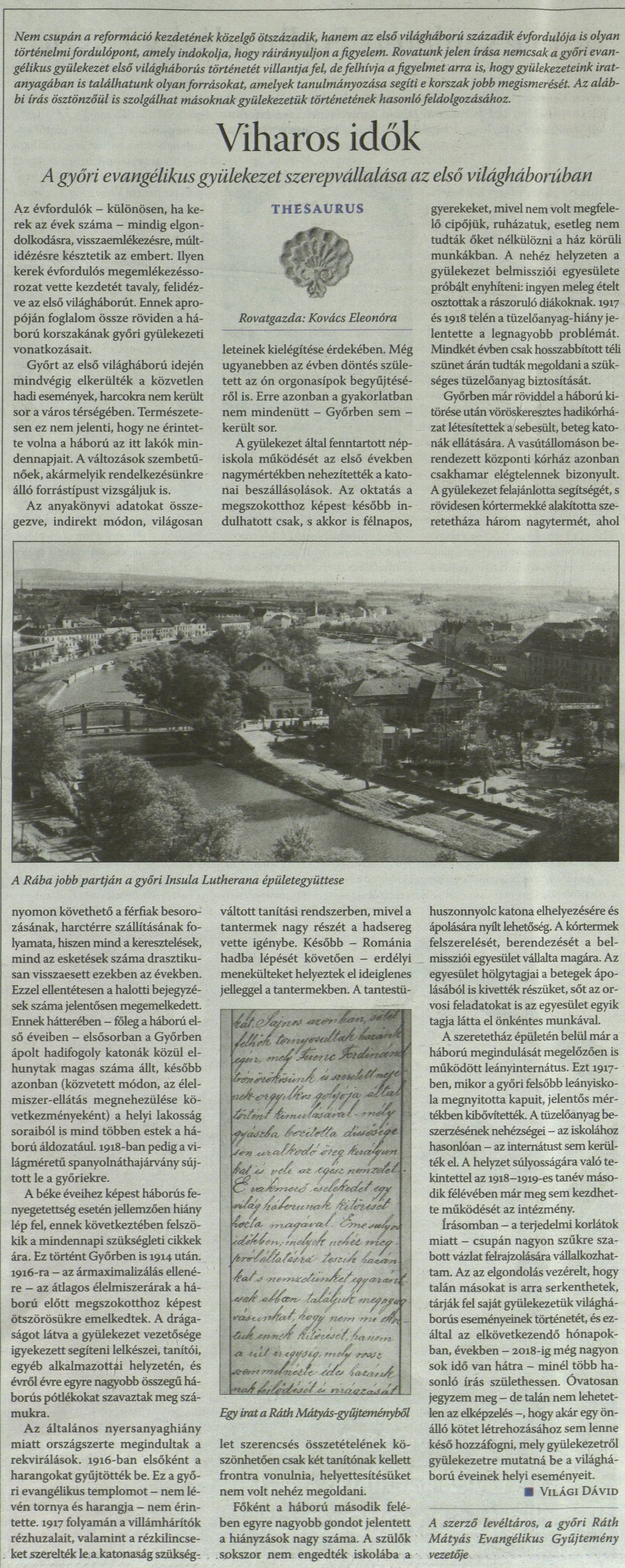 Világi Dávid: Viharos idők. A győri evangélikus gyülekezet szerepvállalása az első világháborúban
