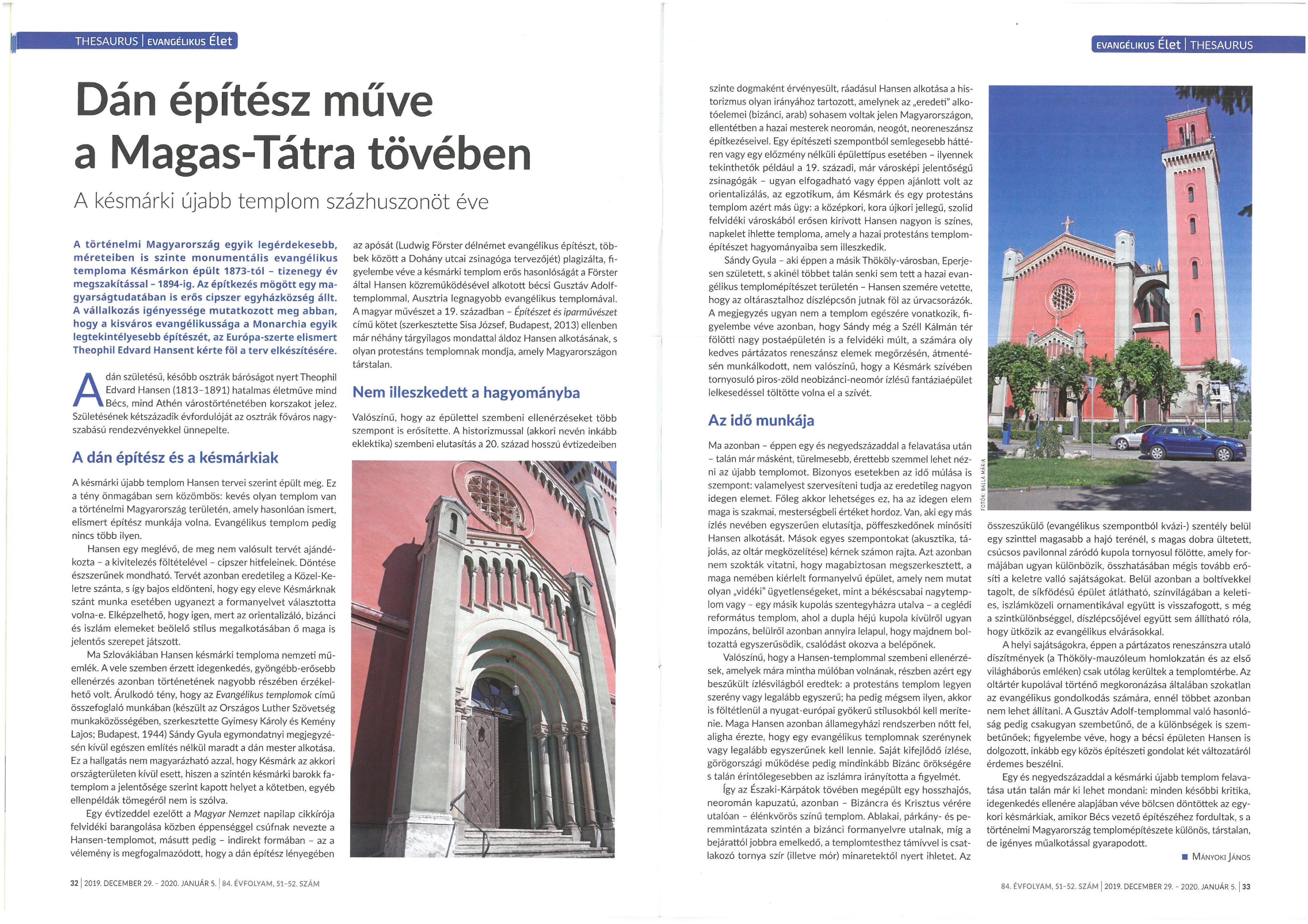 Mányoki János: Dán építész műve a Magas-Tátra tövében - A késmárki újabb templom százhuszonöt éve