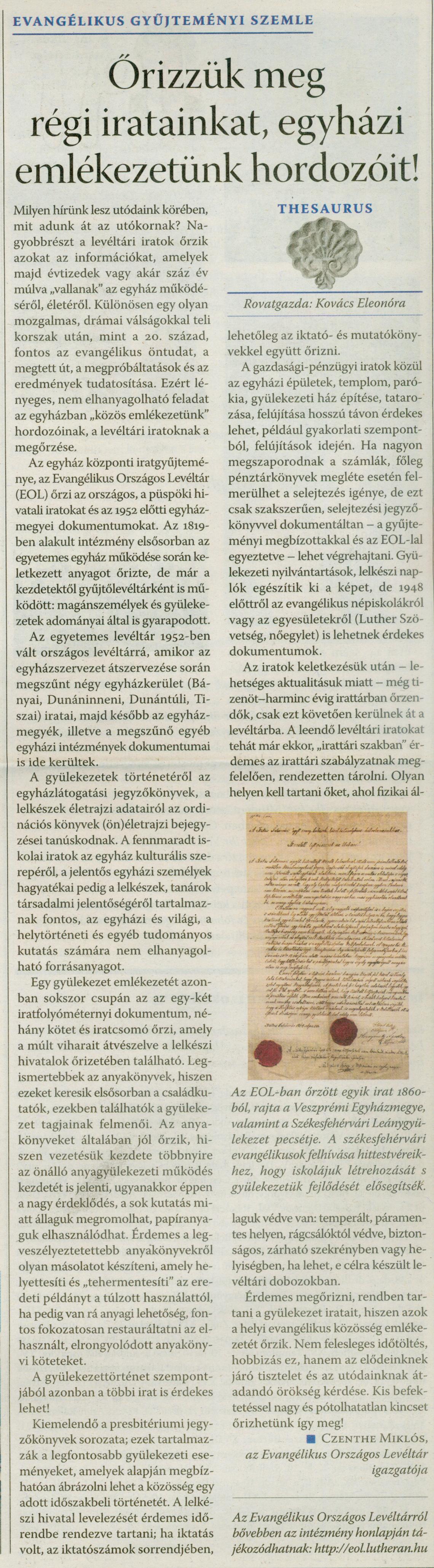 Czenthe Miklós: Őrizzük meg régi iratainkat, egyházi emlékezetünk hordozóit!