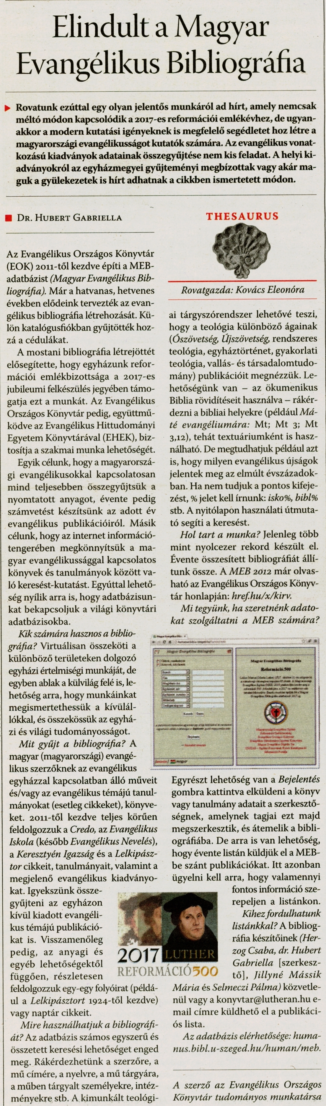 H. Hubert Gabriella: Elindult a Magyar Evangélikus Bibliográfia