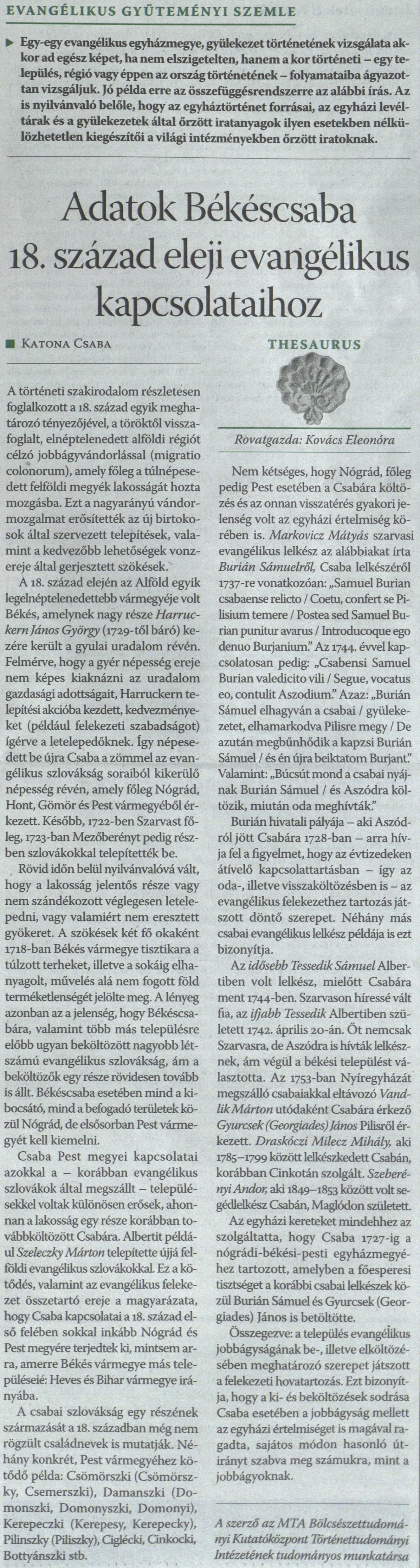Katona Csaba: Adatok Békéscsaba 18. század eleji evangélikus kapcsolataihoz